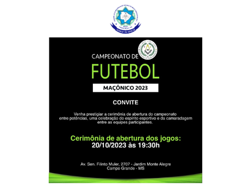 A Aug∴ Resp∴ Loja Simbólica Acácia do Sul, do Grande Oriente de Mato Grosso do Sul (GOMS) está promovendo o Campeonato de Futebol Maçônico 2023. A cerimônia de abertura dos jogos acontece neste dia 20 de outubro (Sexta-feira) às 19h30 na Avenida Senador Filinto Müller, 2707, no Jardim Monte Alegre, em Campo Grande – MS. A competição é aberta para as três Potências Maçônicas regulares e reconhecidas.