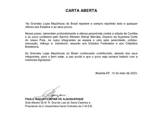 A Sereníssima Grande Loja Maçônica do Estado de Mato Grosso do Sul, juntamente com outras 25 Grandes Lojas do Brasil, assinam Carta da CMSB, em apoio a cidade de Curitiba/PR e ao povo curitibano repudiando as declarações ofensivas do Decano da Suprema Corte, Ministro Gilmar Mendes.