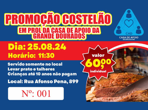 Acontece neste domingo, dia 25 de agosto, no espaço da Loja Cinquentenário de Dourados, o 1º Costelão em prol da Casa de Apoio da Grande Dourados.
